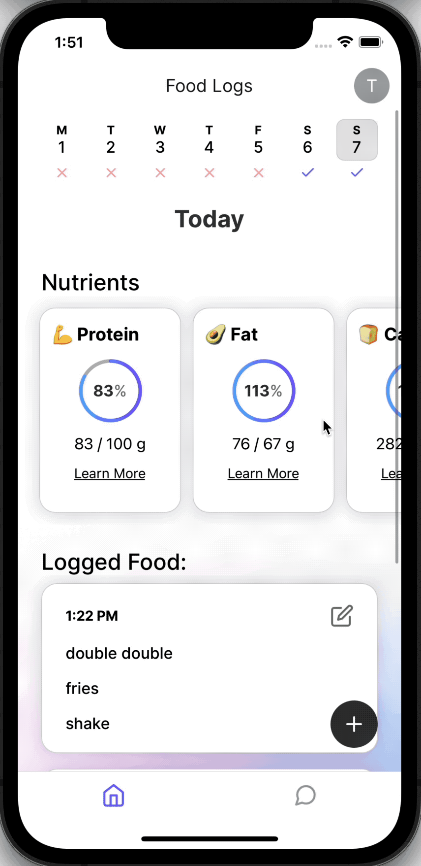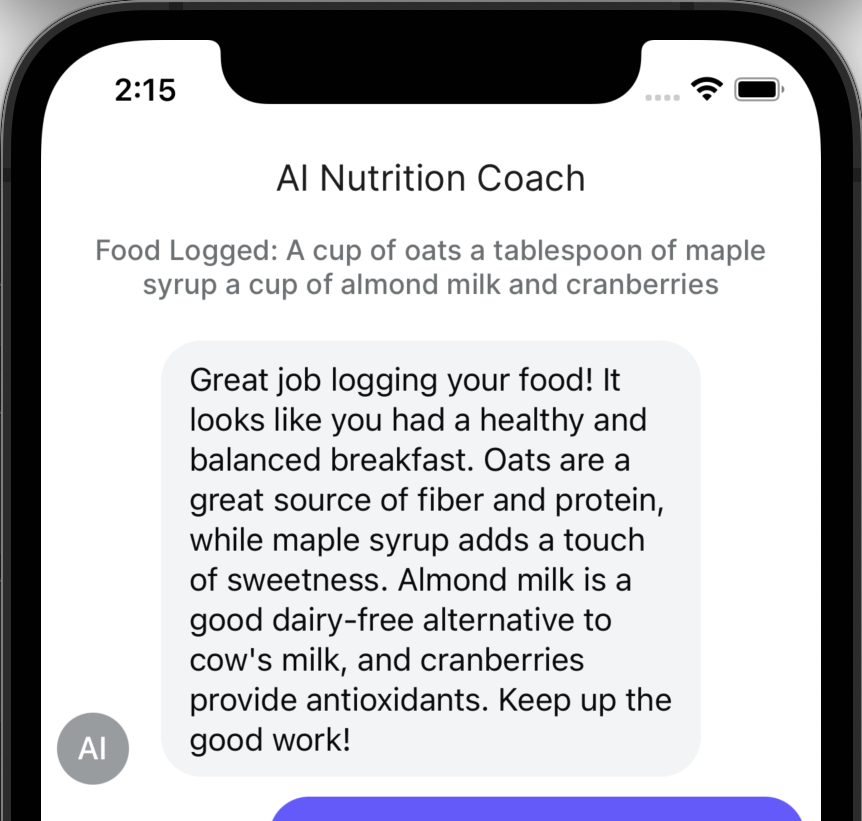 Engage in dynamic conversations with the AI coach, asking questions and receiving personalized suggestions or feedback based on your logged meals.